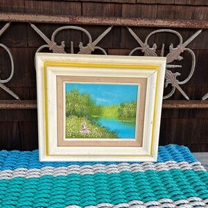 Vintage Landscape Impressionist Oil Painting of a Lady by a Lake. Signed by the artist but I cannot read it. The frame measures approximately 18 x 14.5 x 2.5. It has some nicks and scratches as seen in photos. You can always change the frame. I think it adds to the painting.
