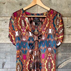 This vintage Lane Bryant dress features a gorgeous all-over multi-color pattern in a flowy midi length. It has short sleeves, a v-neckline with gathering at the chest, an a-line silhouette and a tie back to nip in the waist.