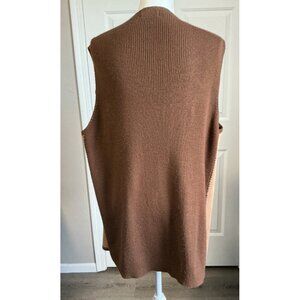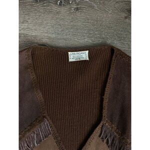 This Vintage Lane Bryant Fringe Leather Front Sweater Vest in XL size exudes a Western, Festival, and Boho vibe. Made from a combination of leather and acrylic materials, this vest features a stylish fringe detail that adds a touch of flair to the design. The rich brown color adds a touch of sophistication to the overall look, making it a versatile and trendy piece for women's fashion. Review photos for signs of wear