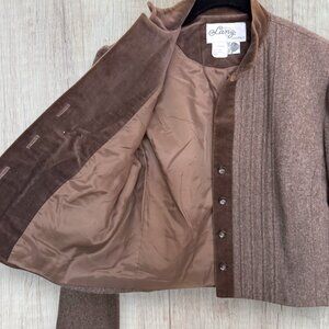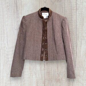 Elegant vintage Lanz Originals two-piece wool suit featuring a cropped jacket and matching A-line skirt with rich brown velvet trim. Made in Austria with pure wool and fully lined — a timeless heritage look with classic alpine flair, perfect for fall and winter wear.