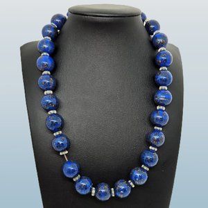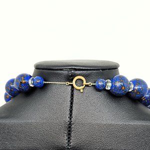 Add a touch of vintage elegance to your wardrobe with this stunning Lapis Blue/Clear beaded necklace. The necklace measures 16 inches in length and features beautiful 13-14MM beads. The clear beads complement the striking blue hue of the Lapis stones, creating a perfect balance of color and style. The beaded design gives it a classic and timeless look that can be worn for any occasion. Whether you're dressing up for a special event or just adding a touch of sophistication to your everyday outfit, this necklace is the perfect accessory to complete your look.