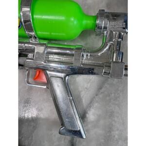 Step back into summer fun with this vintage Larami Super Soaker 50 – 10th Anniversary Edition. A collectible re-release of the original Super Soaker 50, this limited edition features a chrome body with bright green tank and was produced around 2000 to celebrate 10 years of the Super Soaker brand.