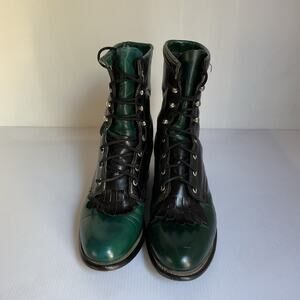 laredo roper boots, vintage laredo boots, lace up western boots, green black leather boots, womens 6.5 boots, cowboy roper boots, kiltie fringe boots, vintage western footwear, emerald green boots