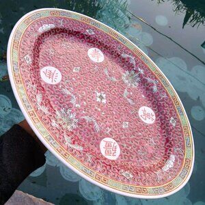 Vintage Large 16" Red Chinese Famille Rose Longevity Pattern Porcelain Oval Platter