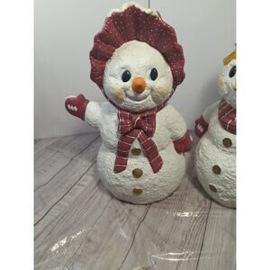 This vintage set from 1990 features a large, round ceramic statue of a snowman couple, snow woman measuring 15 x 8 1/2 inches. Snowman measuring 15 x 8 1/2 inches. These are in excellent condition. No chips or cracks. Very well stored