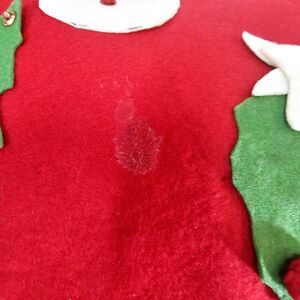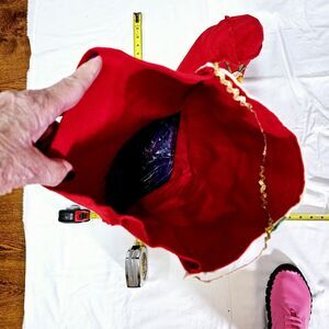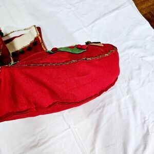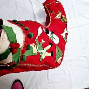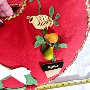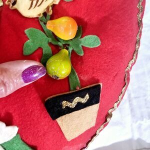 Hand-made stocking with sequins, pom pons, and gold rick rack trim. Notice the pears in the pear tree , the hard plastic silver snowflake! This stocking is about 22" by 22" and at the base 4" wide. Felt pieces are fabulous examples of 1960s decor and crafts. There are places where glue was wiped off from some mishap while making it. Notice the elf face and letter!! Gold rick rack hanger...some rick rack needs to be glued. Darling retro piece for your Mid-century Christmas home!