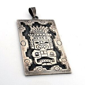 Vintage Large Aztec Idol Mayan Tribal Sterling 925 Silver MEXICO rectangle Pendant