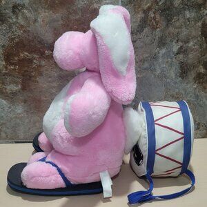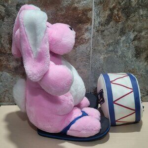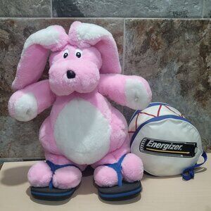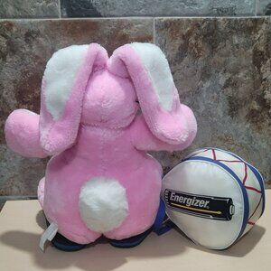 Pink plush rabbit wearing blue flip-flops and includes a drum bag with the Energizer logo, drumsticks are missing.