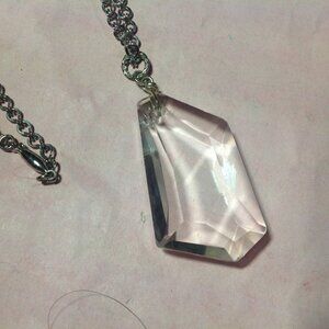 Here is a vintage from the 1970s large faceted Art Deco clear crystal glass pendant on a silver tone chain that closes with a magnetic pin clasp. The bezel for the pendant is made of wrapped silver wire that dates it to the 70s. The crystal pendant and chain are in very good condition. I have never worn it.