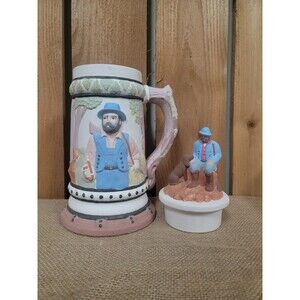 This vintage large German decorative beer stein stands at 13 inches tall, handpainted with a unique design featuring a man on the lid. Made in Germany, this lidded stein falls under the theme of breweriana, adding a touch of history and tradition to any beer collection. Perfect for collectors or those looking to add a unique piece to their home decor, this stein combines craftsmanship and cultural charm in one decorative item.