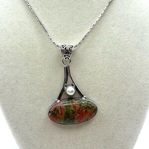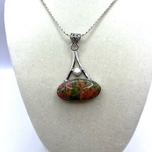 Vintage Large Green Orange Unakite Jasper Pearl Sterling Silver Necklace Pendant