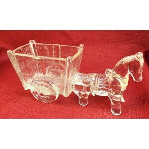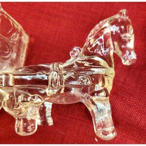 A finely crafted vintage glass figurine depicting a horse pulling a carriage. Its intricate design and clear glass composition make it an elegant decorative piece for any setting.