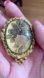 The pendant opens up as a locket or compact. It measures approximately 2” long and features colors or beige, purple, pink and gold.
