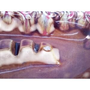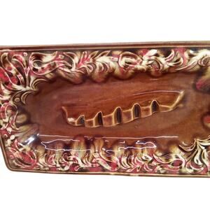 This vintage ashtray by Maurice of California is a stunning piece of mid-century modern art pottery. The rectangular tray has a glossy finish and features a drip-glaze design in a beautiful shade of brown. It is made of high-quality ceramic material and is suitable for use as a cigarette ashtray.