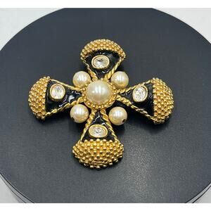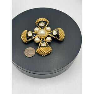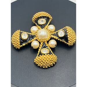 Vintage Large Maltese Cross Brooch Gold Tone Black Enamel Faux Pearls Rhinestone