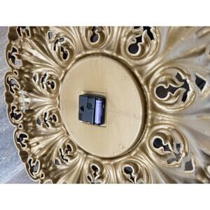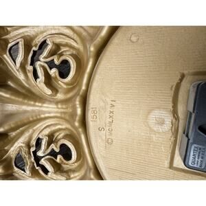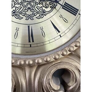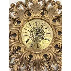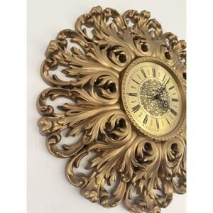 Beautiful and eye-catching vintage Syroco wall clock featuring an ornate mid-century design in rich gold tones. Crafted from molded resin with intricate detailing that resembles hand-carved wood, this piece perfectly captures the Hollywood Regency / Baroque Revival style popular during the mid-20th century.