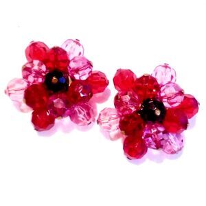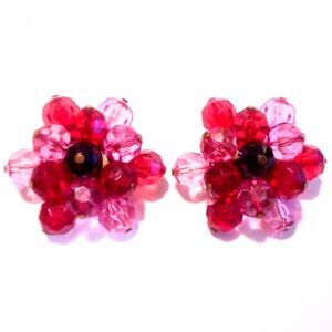 Vintage Large Red and Pink Faceted Bead Cluster Clip On Earrings