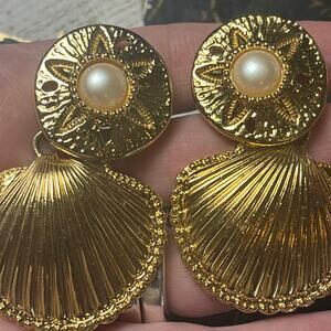These gold plated, oversized, faux pro clip on earrings are to die for! Limited addition by Avon, the top of each earring is a lustrous gold sand dollar with a pearl center, the lower hied bottom is a gorgeous clamshell. Very special for your jewelry collection or as a gift for someone who loves 80s runway glam unusual and oversized vintage pieces.