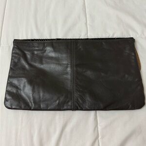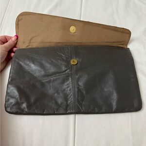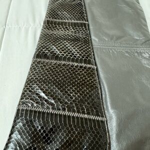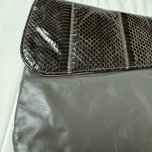 Vintage Large Grey Brown Black Leather Snakeskin Clutch Purse 80’s. Made in Haiti. Stylish black and gray leather clutch. Features a sleek design with textured detail. Fabric interior, One interior zip pocket, magnetic closure, 13” x 8”.