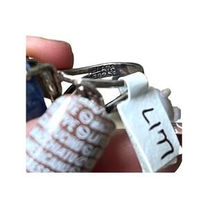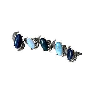 These sterling silver feather rings have different gemstones in the center. Two appear to be sodalite, two quartz and a green stone that may be jasper. The rings are marked 925 for sterling silver.