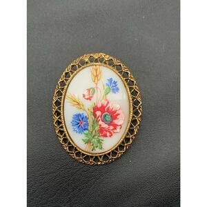 This vintage large white glass brooch features a beautiful oval design with blue and red flowers, set in a faux bamboo goldtone frame. The multicolor floral theme adds a touch of beauty and elegance to any outfit. The intricate details and unique design make it a charming statement piece for those who appreciate vintage jewelry with a touch of nature-inspired charm.