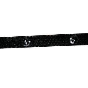Brown leather has a cross hatch design with silver star hardware and white stitching.
