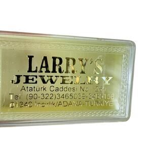 Good preowned condition, does have some yellowing due to age on bottom piece. Vintage Larry's Jewelry Turkey Clear Small Jewelry Case.