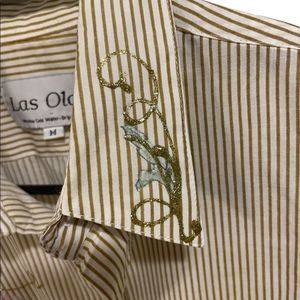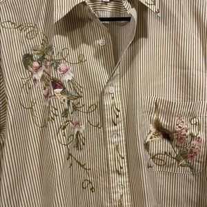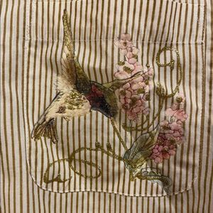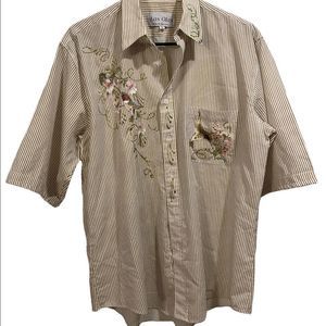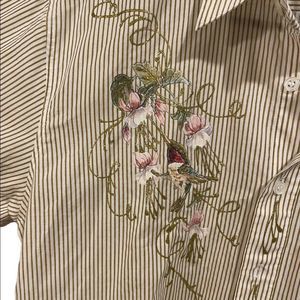 Vintage Las Olas Gold and White Hummingbird Floral Short Sleeve Button Up Top