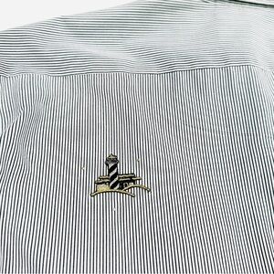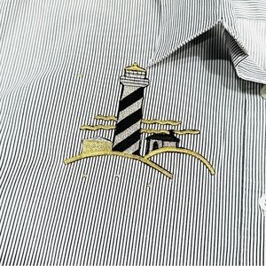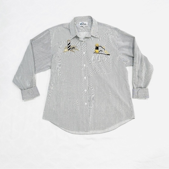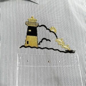 Vintage Las Olas Nautical Lighthouses Embroidered & Embellished Button Down Striped Shirt - EUC - size L