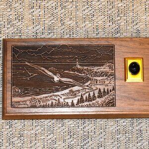 Vintage Lasercraft laser engraved pen holder. Style: Coastline. Image features flying birds and coastline. Measures approximately 6.5" x 3.25" (top) and 6.75" x 3.5" (bottom). About 1" tall. Comes in original box (box shows some age and has a few stains). Packaged with care for safe shipment.