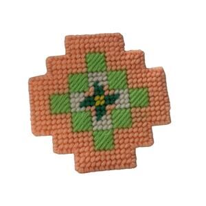 This vintage latch hook coasters set of 8 features a unique cactus design, measuring 4.25 inches in size. Each coaster is handcrafted and finished, showcasing intricate latch hooked detailing. Perfect for adding a touch of vintage charm to any tabletop or shelf, this set is ideal for crafters looking to create one-of-a-kind pieces for their home decor.