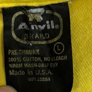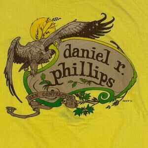 Bright yellow vintage tee featuring an illustrated eagle and scroll graphic by California artist Bill Ogden, known for his surf and psychedelic artwork of the 1970s. Soft, thin cotton/poly blend typical of late-’70s tees. Single-stitch sleeves and hem.