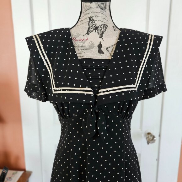 Late ’80s Cynthia Howie for Maggy Boutique dress in excellent vintage condition. Navy pinpoint polka dot with a dramatic bib collar and fitted sheath skirt. Size 4 (vintage) — perfect for classic, polished retro styling.