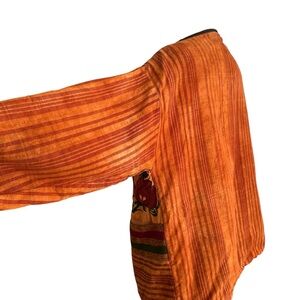 This bold colorful jacket is handmade in Mexico or Central America and features a rich burnt orange striped base with vibrant hand-embroidered floral panels. It has an open-front design, relaxed fit, statement relaxed sleeves and large drop in pockets with artisanal ikat weave detail.