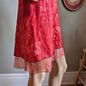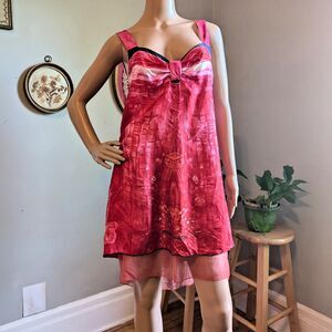 Vintage 2000s (Y2K) Launch by Susan Young pink mini dress with Halston print. Silk. Pink mirrored tie dye/rorschach print. Bow at bust with small keyhole. Pink straps. Sleeveless. Semi-sheer under layer. Layered look. Zip up side. Lightweight. Dress is in good vintage condition with light wear. Possible loose threads.