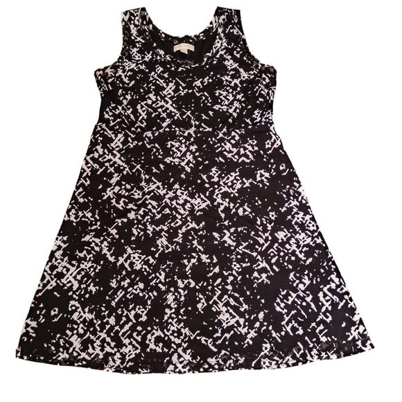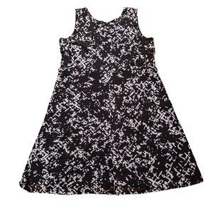 This is a lovely vintage Laura Ashley polyester/nylon A-Line dress. This dress has a stylish abstract black and white print. The material is stretchy and comfortable. This dress is so easy and can be dressed up or worn with flip flops. This is a classic timeless dress that will never go out of style. This dress is a women’s size 1X. Measurements lying flat: pit to pit- 20.5 inches, length- 35 inches.