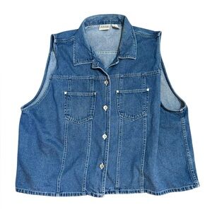 Classic denim vest with button closure. Features two front pockets. Sleeveless design.