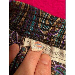 Step back into timeless boho style with this vintage Laura Jean skirt. Made in the USA and crafted from 100% rayon, this piece features a rich paisley print in earthy brown accented with teal, purple, and tan. The flowing drape, elastic waistband, and midi length make it both flattering and comfortable — a versatile wardrobe staple for vintage lovers.