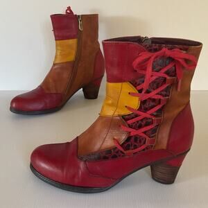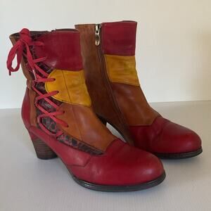 Step into bold, artistic style with these Laura Vita Bohemian patchwork leather ankle boots in women’s size 8.5. Featuring a unique combination of red, brown, and yellow leather panels with lace-up sides, inner zippers for easy wear, and a comfortable chunky heel, these boots are a statement piece perfect for any eclectic, vintage, or artsy wardrobe.