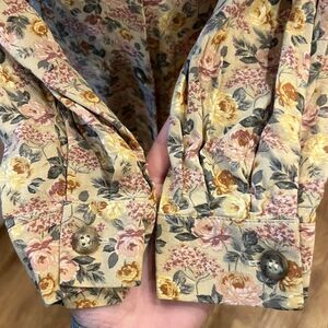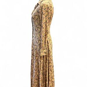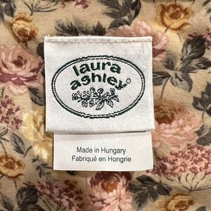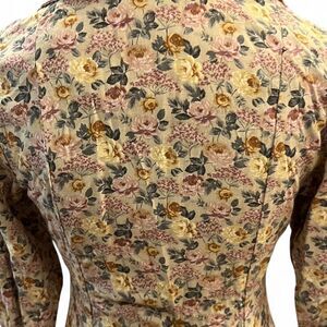 This gorgeous dress is a vintage Laura Ashley piece. It’s a long-sleeve button-down dress with a floral pattern. Laura Ashley is known for its vintage floral designs, particularly in dresses, and this dress exemplifies that aesthetic. The dress features a collared neckline, button-down front, and a flowing skirt, typical of the prairie or Victorian-inspired styles popular during that era. The floral pattern consists of small flowers in shades of pink, yellow, and green on a creamy background. The fabric is a viscose rayon and wool blend, which was commonly used by Laura Ashley. #vintage #lauraashley #cottagecore #floral #americanvintage