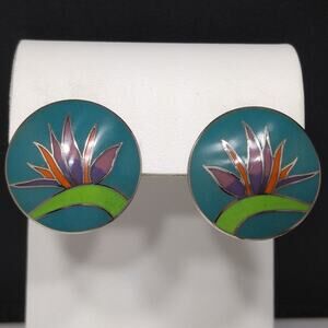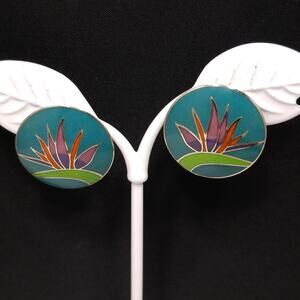 Vintage Laurel Burch Bird of Paradise Post Earrings, Silver Tone Cloisonné
