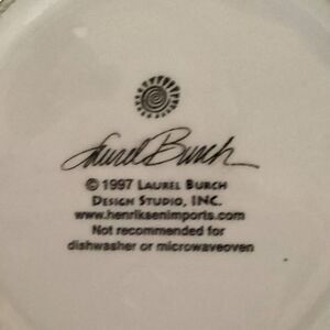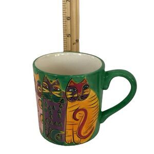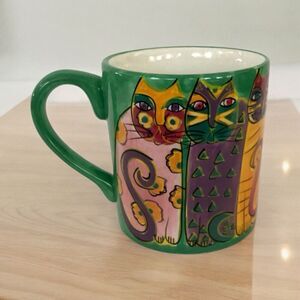 The Vintage Laurel Burch Cat Mug from 1997 is a collectible ceramic coffee cup featuring a cat print pattern with a multicolor design. This decorated mug is suitable for hot beverages and was manufactured in the 1990s, making it a vintage piece that would be a unique addition to any kitchen or home decor collection. Lauren Burch's distinctive style and attention to detail make this mug a charming and functional item for cat lovers and collectors alike.