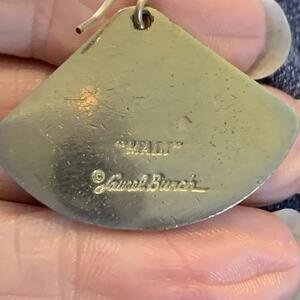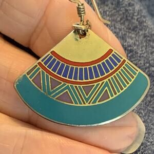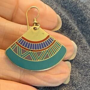 This listing is for a pair of Vintage Laurel Burch Earrings. These are signed Mali Fan pattern Enamel Dangles, with gold tone ear wires and accents. These are hallmarked on the silver tone backs, in good condition. The finish shows a little wear, commensurate with age. Very wearable and on-trend.