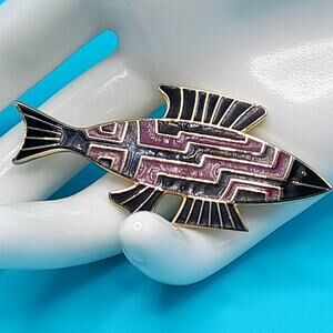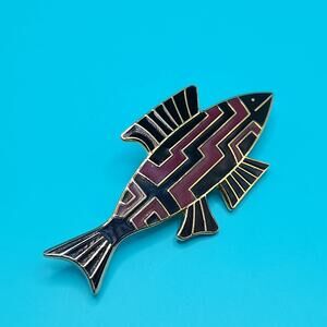 This vintage Laurel Burch Fish brooch is a collectible treasure from the 1980s. Crafted in gold-plated metal with black and reddish-brown enamel outlined in cloisonné gold, it showcases Burch’s bold artistic style. Known for whimsical, colorful jewelry, Laurel Burch pieces remain highly collectible and beloved.