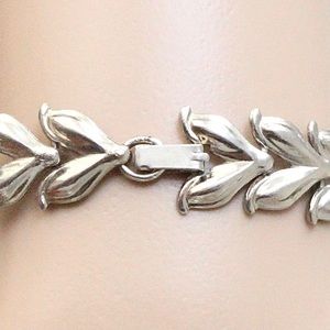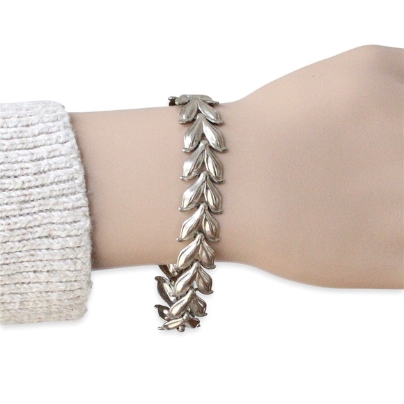 Vintage silver tone laurel leaf link bracelet. Acquired from a private estate collection, this retro bracelet features Roman or Greek goddess style laurel leaves that form a slinky wreath design. Fold over clasp closure. 7.25” length and 0.5” width. Good pre-owned condition with light surface wear commensurate with age.