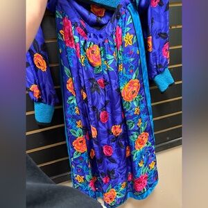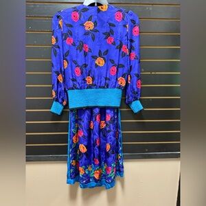 Make a bold statement in this stunning vintage Lauren Alexandra Petites dress. Crafted from luxurious 100% silk, this vibrant piece features a royal blue jacquard base adorned with vivid pink, yellow, and orange floral prints. The faux wrap bodice, puff shoulders, and long sleeves with teal knit cuffs create a unique silhouette, while the matching knit waistband flatters the figure. A flowing midi skirt with a striking border print completes the look.