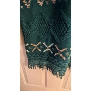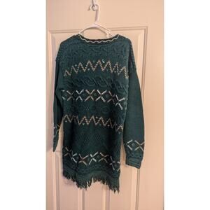 Excellent condition hand knit Lauren Hansen vintage sweater dress, green, white, cream fringe bottom, chunky knit