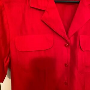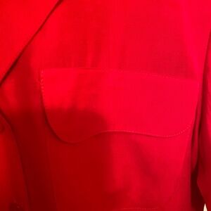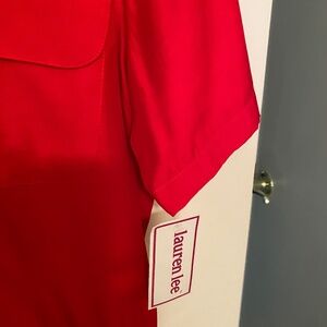 Vintage size 10 Lauren Lee Red Blouse. Never worn (tag still attached), true red 80's blouse. It is a size 10, has shoulder pads. Shoulder seam to shoulder seam is 16 inches. Measuring from the back collar to hem equals 27 inches. Front has 5 button closure with two pockets (with flaps).