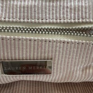 This vintage Lauren Merkin clutch is a rare, elegant piece crafted in New York City from glossy olive green patent leather. Known for her minimalist yet structured designs, this pleated clutch features a signature blush pink striped satin lining, a silver-tone nameplate, and an interior zip pocket. A discontinued and collectible style, this bag is perfect for weddings, events, or adding a touch of retro-luxe to your outfit.