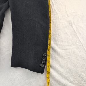 The blazer features a classic two-button closure and a subtle notched lapel. The structured shoulders and clean lines offer a tailored and refined silhouette. Inside, the lining is a smooth, satiny fabric, while the inner sleeve lining has a subtle striped pattern, a testament to the attention to detail.